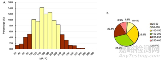 2016年的一篇文章對(duì)這683種口服藥物的熔點(diǎn)分布進(jìn)行分析,結(jié)果如圖2所示。2A(黃色柱),近80%的口服藥物(76.6%)的MP在100-240°C范圍內(nèi),口服藥物MPs的最高峰值范圍為140-160°C(>14%)。餅圖2B表明,近60%的口服藥物(58.4%)的MP在100-200°C范圍內(nèi),近90%的口服藥物(89.2%)在50-250°C范圍內(nèi)。