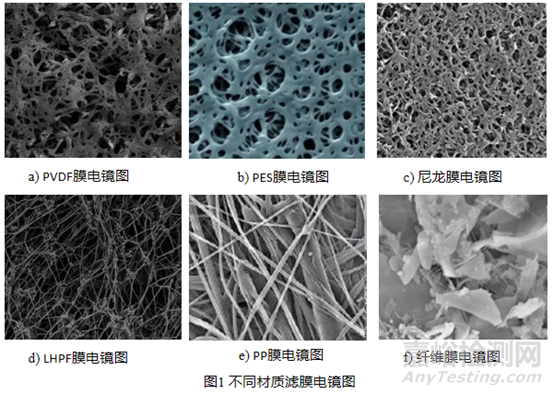 不同材質(zhì)濾膜其微觀孔徑結(jié)構(gòu)也存在差異,各材質(zhì)濾膜電鏡圖見(jiàn)圖1。