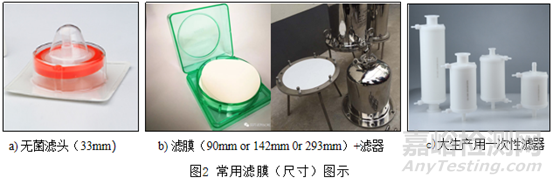 在使用過(guò)程中,濾膜過(guò)濾面積過(guò)大會(huì)導(dǎo)致產(chǎn)品損耗增大,收率降低,成本增加;過(guò)濾面積過(guò)小會(huì)使過(guò)濾速度減慢、過(guò)濾時(shí)間延長(zhǎng),藥液長(zhǎng)時(shí)間暴露容易增加微生物污染風(fēng)險(xiǎn),同時(shí)過(guò)程中有大量過(guò)濾物質(zhì)堆積使濾膜堵塞,甚至破損報(bào)廢等,使微生物污染風(fēng)險(xiǎn)進(jìn)一步加大。因此也需要根據(jù)過(guò)濾介質(zhì)體積進(jìn)行濾膜尺寸選擇。例如,過(guò)濾體積低于300ml,一般選擇直徑33mm的針式濾頭,其有效過(guò)濾面積約為4.5cm2,過(guò)濾300m可在l5min內(nèi)完成;若體積大于1L-5L建議使用142mm濾膜配合合適大小濾器,其有效過(guò)濾面積為126cm2,20min內(nèi)可完成5L藥液過(guò)濾。若是大生產(chǎn)體積較大,可根據(jù)批量選擇適當(dāng)尺寸濾芯。另外,實(shí)際應(yīng)用過(guò)程中也應(yīng)該注意過(guò)濾系統(tǒng)整體結(jié)構(gòu)的合理性,以防止存在衛(wèi)生死角等。除菌過(guò)濾常用濾膜(尺寸)見(jiàn)圖2。