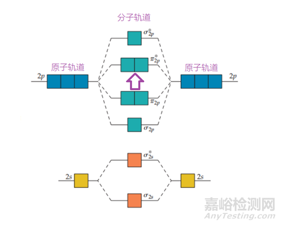 分子由原子組成,原子中的電子分布在不同的能級(jí)上,如2s,2p等。按照分子軌道理論,當(dāng)原子結(jié)合成分子時(shí),原電子能級(jí)會(huì)發(fā)生變化,形成新的分子軌道。如s軌道為球形,沿球心方向取得最大重疊,形成σ2s和σ2s*兩個(gè)軌道,其中σ2s為成鍵軌道,能量較低,σ2s*為反鍵軌道,能量較高。p軌道有三個(gè),為啞鈴型,在空間中分布于x,y,z軸,在x軸方向px取得最大重疊,形成σ2p和σ2p*軌道,py和pz不能取得最大重疊,在波函數(shù)符號(hào)相同的部分形成兩個(gè)π2p軌道,波函數(shù)符號(hào)不同的部分形成兩個(gè)π2p*軌道,π2p軌道為成鍵軌道,π2p*軌道為反鍵軌道。電子優(yōu)先排布在成鍵軌道。