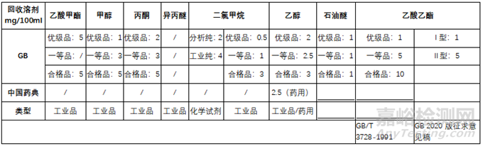 對(duì)于不揮發(fā)物的控制,查詢參考溶劑的GB標(biāo)準(zhǔn),中國(guó)藥典等官方公布的溶劑標(biāo)準(zhǔn),以此作為不揮發(fā)物限度制定的部分參考依據(jù),如: