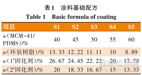 按照表1配方稱取MCM-41/PDMS、環(huán)氧樹脂、1#固化劑和2#固化劑于燒杯中,加入占配方總質(zhì)量90%的丙酮作稀釋劑,用玻璃棒攪拌均勻后在均質(zhì)分散機(jī)中分散10 min(轉(zhuǎn)速為20 000 r/min)制得超疏水涂料。