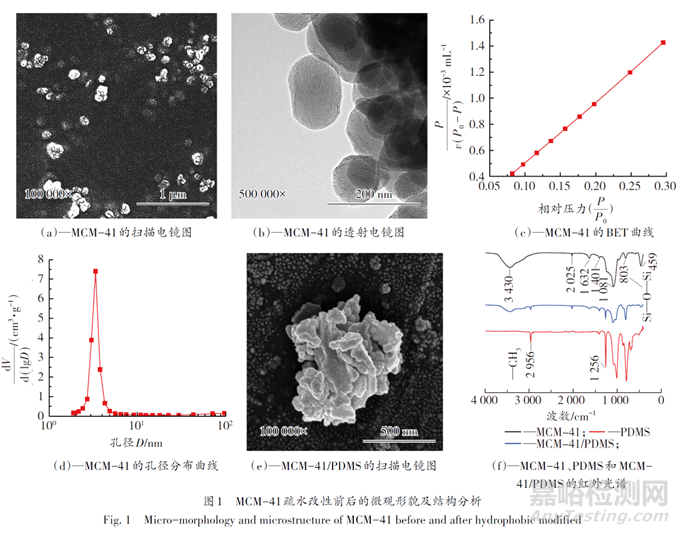MCM-41的微觀形貌采用透射電子顯微鏡和場(chǎng)發(fā)射掃描電子顯微鏡表征;MCM-41/PDMS和超疏水涂層的微觀形貌通過掃描電子顯微鏡表征;超疏水涂層的粗糙度通過共聚焦顯微鏡表征。
