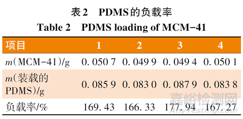表2結(jié)果表明,MCM-41裝載PDMS的負(fù)載率集中在166%~178%,該結(jié)果充分說明MCM-41對(duì)PDMS的吸附能力較強(qiáng)。