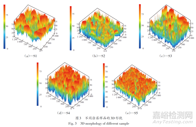 為了進(jìn)一步探究涂層表面的粗糙度,用共聚焦顯微鏡來表征涂層表面的三維形貌,結(jié)果如圖3所示。