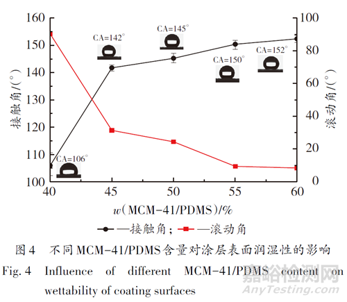 圖4 為不同MCM-41/PDMS 含量的涂層表面的接觸角(CA)和滾動(dòng)角(SA)。