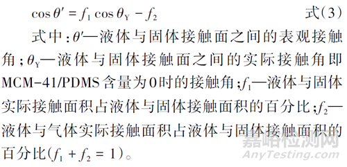 從圖4可以看出,隨著MCM-41/PDMS含量的增加,CA增大,SA減小。當(dāng)MCM-41/PDMS含量增加到55%時(shí),CA=150°,SA=9°,形成一個(gè)超疏水表面。當(dāng)MCM-41/PDMS含量增加到60%時(shí),得到最大的接觸角152°和最小的滾動(dòng)角8°。其CA和SA的變化規(guī)律一方面可以通過微觀形貌和表面粗糙度解釋,另一方面可以通過Wenzel 和Cassie-Baxter 模型進(jìn)行解釋,如式(3)所示。
