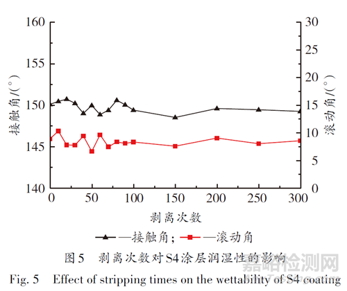 從圖5可以看出,S4樣品在經(jīng)過300次3M膠帶剝離測(cè)試后仍然保持超疏水性。接觸角幾乎沒有變化,穩(wěn)定在150°左右,滾動(dòng)角在0~90次剝離試驗(yàn)時(shí)在10°附近輕微變動(dòng)(總體不超過10°),之后基本保持在10°左右。