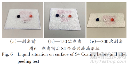 盡管引入微-納結(jié)構(gòu)可以有效提高涂層疏水性,但是涂層的耐膠帶剝離性能及耐磨性仍然存在挑戰(zhàn),因?yàn)闀?huì)有部分微-納結(jié)構(gòu)的顆粒從樹脂基體中脫落從而降低其疏水性。本研究采用S4樣品進(jìn)行膠帶剝離測(cè)試和耐磨性測(cè)試。膠帶剝離測(cè)試結(jié)果如圖5~圖7所示。