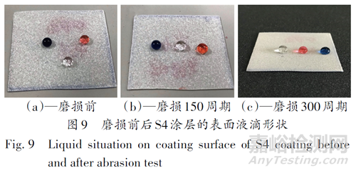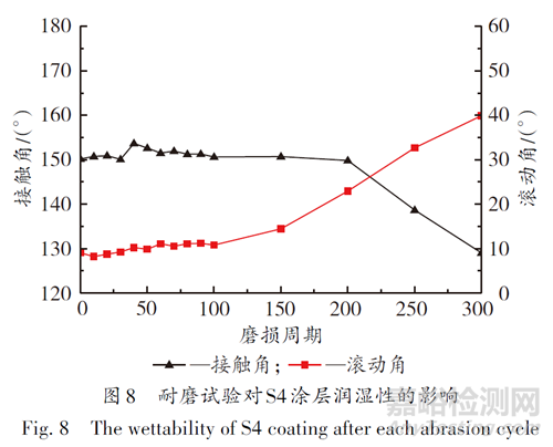 從圖8可以看出,涂層的接觸角和滾動(dòng)角在磨損100周期后保持穩(wěn)定,但是在150周期磨損后,接觸角下降,滾動(dòng)角增加。在300周期之后涂層超疏水性消失,接觸角為129°,滾動(dòng)角為40°。