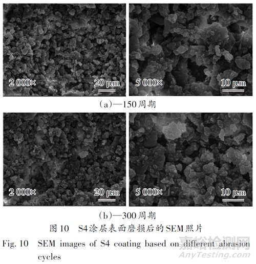 從圖9可以看出,在150周期磨損后,液滴仍然保持球形,但是到300周期后液滴變?yōu)榍蚬谛?。從圖10的SEM照片也可以看出,在150周期后,涂層表面仍然具有較高的粗糙度,這是疏水性保持的關(guān)鍵。然而,300周期磨損后,納米乳突減小,涂層表面某些區(qū)域變得較為平坦,使得涂層超疏水性喪失。