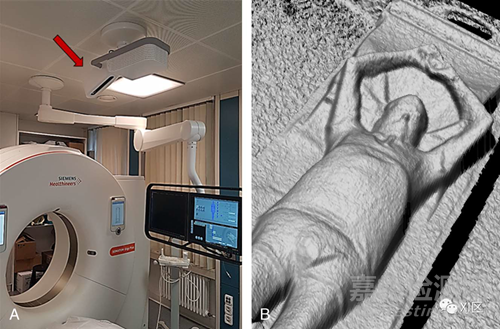 三維相機(箭頭)放置在 CT 檢查床的上方(A)。使用三維深度相機獲得的患者三維表面圖像(B)。