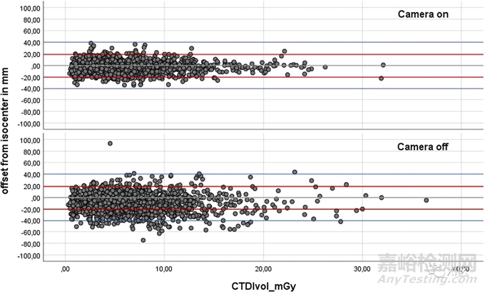3D攝像頭打開和關(guān)閉時患者等中心偏差(以毫米為單位)與患者輻射量(CTDIvol,以mGy為單位)之間的關(guān)系。