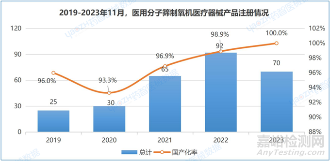從產(chǎn)品注冊情況來看,2019-2022年注冊數(shù)量總體呈上升趨勢。2023年截至11月共70項產(chǎn)品注冊,五年國產(chǎn)化率在97.0%左右,其中有效期內(nèi)首次注冊醫(yī)用分子篩制氧機醫(yī)療器械占36.9%。