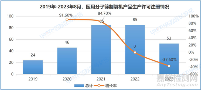據(jù)統(tǒng)計,截至2023年8月,全國可生產(chǎn)醫(yī)用分子篩制氧機醫(yī)療器械產(chǎn)品的生產(chǎn)企業(yè)共有201家。2021年與2022年注冊醫(yī)用分子篩制氧機醫(yī)療器械產(chǎn)品生產(chǎn)許可證數(shù)量最多,均為85項。