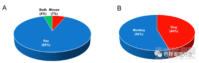 雖然ICH M3(R2)提及多肽藥物不在該指南范圍內(nèi),ICH S6(R1)則將化學(xué)合成或重組表達(dá)的多肽納入指導(dǎo)范圍,但實(shí)際情況是,幾乎所有多肽類藥物均參照了ICH M3(R2)開展嚙齒類和非嚙齒類毒理研究。不過,F(xiàn)DA綜述資料里面并未提及如何選擇的種屬,從結(jié)果看,89%(41/46)嚙齒類種屬選擇的大鼠,非嚙齒類則比較均衡,46%(21/46)采用的犬,54%(25/46)選擇的食蟹猴。多肽類藥物的種屬選擇應(yīng)該參照生物藥思路更多一些。