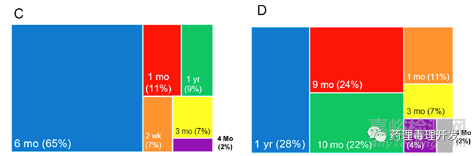 74%嚙齒類研究最長給藥周期持續(xù)超過6個(gè)月(C圖),74%非嚙齒類研究最長給藥周期持續(xù)超過9個(gè)月(D圖)。當(dāng)然,這是最長給藥周期,通常用于支持產(chǎn)品NDA/BLA,支持IND一般不需要開展如此長周期的研究,可根據(jù)臨床試驗(yàn)方案和推進(jìn)進(jìn)度,分階段開展。另外,大部分肽類藥物適用于慢性病如糖尿病等治療,用藥周期長,超過3個(gè)月,所以最長給藥周期基本是指導(dǎo)原則要求的上限。