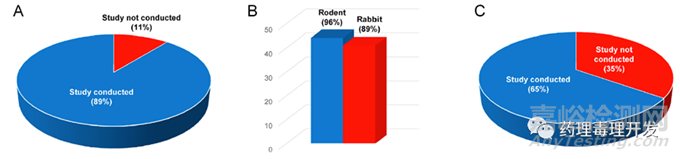 幾乎所有多肽藥物均開展了Ⅰ段嚙齒類生育力研究、Ⅱ段嚙齒類或家兔胚胎-胎仔發(fā)育毒性研究和Ⅲ段嚙齒類出生前、出生后發(fā)育毒性研究。具體比例參見下圖。