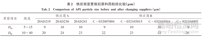 粒度分布:溶出度是影響口服固體制劑在體內(nèi)溶解、吸收的關(guān)鍵指標(biāo),藥品溶出度與原料藥的粒度聯(lián)系緊密,故采用粒度分布儀對變更前后不同供應(yīng)商原料藥的粒徑進(jìn)行檢測。結(jié)果見表2,其中D50和D90分別為顆粒累積分布50%和90%的粒徑,供應(yīng)商A和供應(yīng)商B的原料藥顆粒的D50和D90基本一致。
