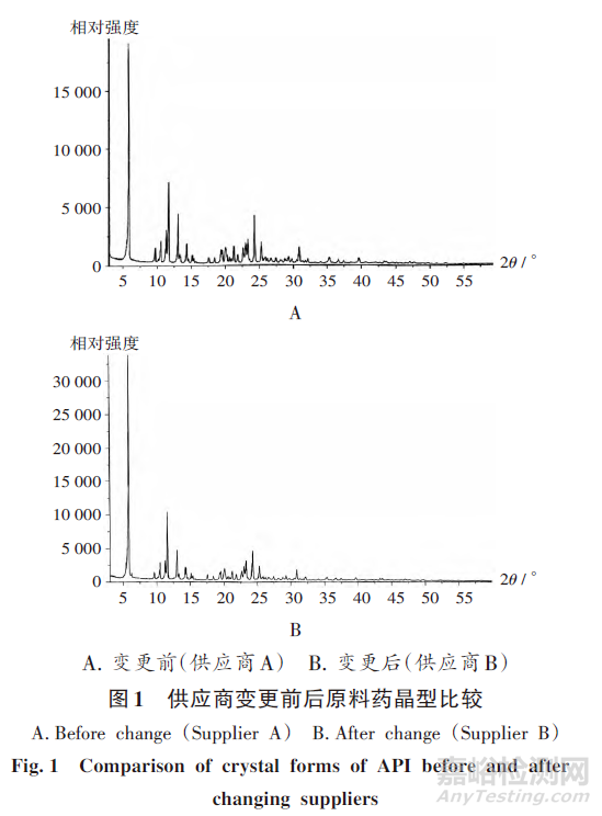 晶型:藥物的晶型對制劑的溶解度和溶解速率、藥物的吸收速率、藥物的臨床療效及安全性等均有影響,故原料藥供應(yīng)商發(fā)生變更時,晶型也是需要考慮的因素之一。對苯磺酸氨氯地平原料藥進(jìn)行X射線衍射(XRD)分析,結(jié)果供應(yīng)商變更前后原料藥晶型一致。詳見圖1。