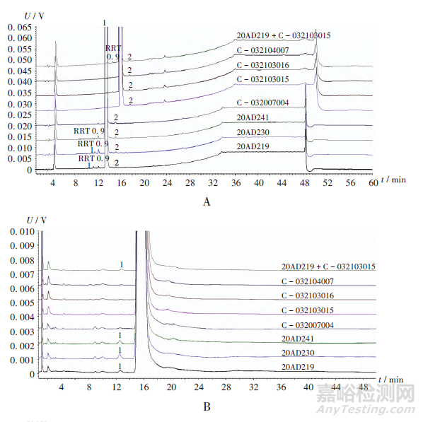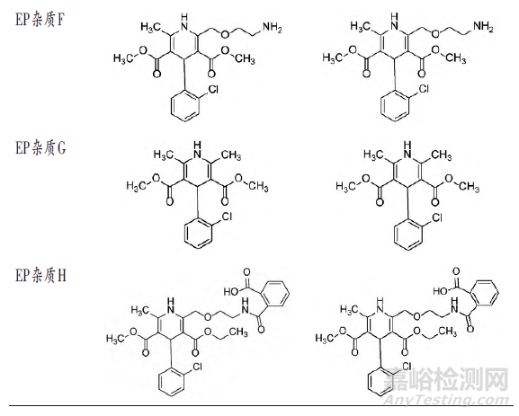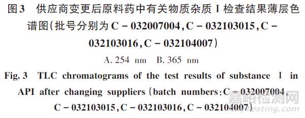 有機(jī)雜質(zhì):對生產(chǎn)工藝路線進(jìn)行對比研究,確定供應(yīng)商變更前后原料藥中有機(jī)雜質(zhì)類別;采用苯磺酸氨氯地平各國藥典標(biāo)準(zhǔn)中收載的有關(guān)物質(zhì)方法,對供應(yīng)商變更前后的原料藥進(jìn)行有機(jī)雜質(zhì)譜對比確認(rèn)。結(jié)果變更前后有機(jī)雜質(zhì)一致(表3),并按藥典標(biāo)準(zhǔn)對各雜質(zhì)進(jìn)行了確認(rèn)(圖2和圖3)。其中,供應(yīng)商變更前,3批(批號分別為20AD219,20AD230,20AD241)原料藥有關(guān)物質(zhì)I于254nm和365nm波長處檢測均符合規(guī)定。