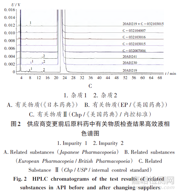 殘留溶劑:根據(jù)供應(yīng)商變更后原料藥的工藝流程,確定可能引入的殘留溶劑,并對原料藥中殘留溶劑及供應(yīng)商B生產(chǎn)的多批次原料藥進(jìn)行研究。結(jié)果供應(yīng)商變更后,4批(批號分別為C-032007004,C-032103015,C-032103016,C-032104007)原料藥中均未檢出殘留溶劑乙醇、乙酸乙酯、苯、甲苯、N,N-二甲基甲酰胺、冰醋酸,表明其生產(chǎn)過程中殘留溶劑控制較好。