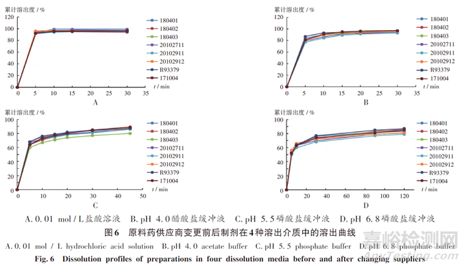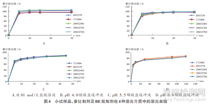 小試研究:采用供應(yīng)商B提供的原料藥進(jìn)行小試研究,按原處方工藝制備3批(批號分別為20032401,20032701,20032702)小試樣品。同時,依據(jù)《已上市化學(xué)藥品藥學(xué)變更研究技術(shù)指導(dǎo)原則(試行)》中第六項“變更制劑所用原料藥的供應(yīng)商”中所需研究驗證工作中“變更前后樣品的溶出曲線、關(guān)鍵理化性質(zhì)應(yīng)保持一致”等規(guī)定進(jìn)行體外釋放研究。參考原國家食品藥品監(jiān)督管理總局發(fā)布的《普通口服固體制劑溶出度試驗技術(shù)指導(dǎo)原則》(2015年第3號)、《普通口服固體參比制劑選擇和確定指導(dǎo)原則》(2016年第61號),比較3批小試樣品、參比制劑(批號為R93379)及BE批(批號為171004)樣品在0.01mol/L鹽酸溶液、pH4.0醋酸鹽緩沖液、pH5.5磷酸鹽緩沖液、pH6.8磷酸鹽緩沖液中的溶出曲線。結(jié)果供應(yīng)商變更后,小試樣品在4種溶出介質(zhì)中的溶出與參比制劑及BE批制劑一致,表明原料藥供應(yīng)商變更后,生產(chǎn)的小試樣品檢測結(jié)果均符合質(zhì)量標(biāo)準(zhǔn)。詳見圖4。