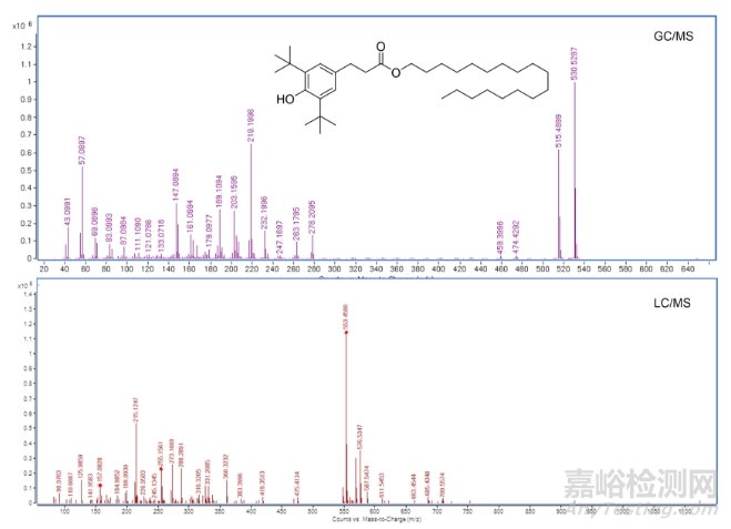 比如,聚烯烴材料通常含有抗氧劑 Irganox 1076、Irgafox 168等。這些物質(zhì)及其降解產(chǎn)物在有機(jī)溶劑的浸提過(guò)程中很可能會(huì)被浸提出來(lái),并被GC/MS和LC/MS分析檢測(cè)到。如果質(zhì)譜解析人員明確知曉這些材料相關(guān)信息并加以利用,這無(wú)疑會(huì)大大提高鑒定結(jié)果的置信度。