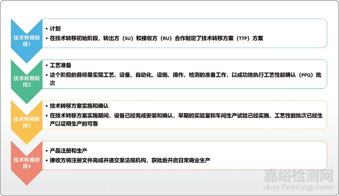 技術(shù)轉(zhuǎn)移是一項復(fù)雜而耗時的工作,因為它涉及多個參與方和場地,一般生物制藥的技術(shù)轉(zhuǎn)移主要包括4個步驟,如圖所示。