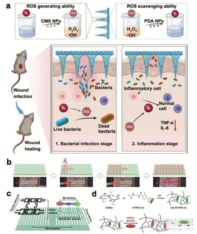 本節(jié)對(duì)(1)抗生素和抗菌肽MNPs;(2)ROS生成和金屬相關(guān)MNPs。進(jìn)行了相關(guān)綜述,總結(jié)了微針在感染傷口中的應(yīng)用。