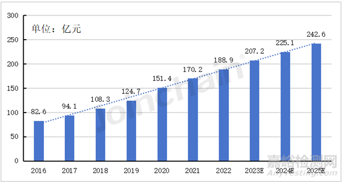 圖2 2016-2025E年中國(guó)中醫(yī)醫(yī)療器械市場(chǎng)規(guī)模及增長(zhǎng)趨勢(shì)