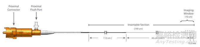該產(chǎn)品由近端連接器(含沖洗孔)、外管和探頭組成。該產(chǎn)品與本公司生產(chǎn)的血管內(nèi)成像設(shè)備(其中控制臺(tái)型號(hào):TA-03-0005)配合使用,用于在醫(yī)療機(jī)構(gòu)中需要進(jìn)行冠狀動(dòng)脈介 入治療患者的冠狀動(dòng)脈成像,包括血管內(nèi)超聲成像(IVUS)和血 管內(nèi)光相干斷層成像(OCT)。一次性使用血管內(nèi)成像導(dǎo)管的 OCT 成像功能適用的冠脈血管直徑范圍是 2.0-4.0mm,不適用 于左冠狀動(dòng)脈主干或以前做過旁路手術(shù)的目標(biāo)血管。