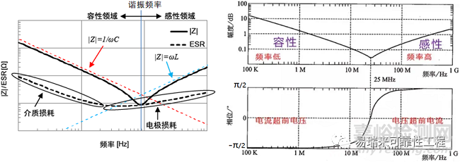 低頻范圍:低頻率范圍的|Z|與理想電容器相似,與頻率呈反比趨勢(shì)減少。