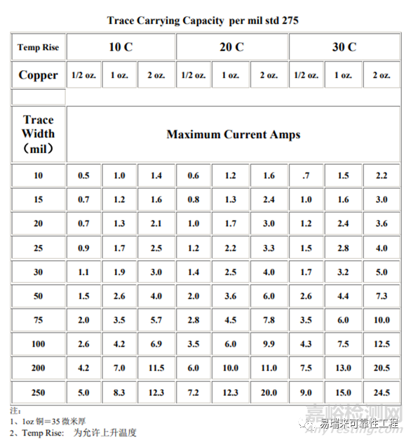 此類噪聲主要由走線的直流電阻與寄生電感造成,需要考慮線路板過孔的通流能力,同時(shí)也要考慮線寬與電流的關(guān)系,如上表1所示。當(dāng)電流通過狹窄區(qū)域時(shí),會(huì)產(chǎn)生較大的電流密度,從而導(dǎo)致PCB局部溫度升高。我們應(yīng)該使板上的電流密度分布均勻,最大值不要超過常用的經(jīng)驗(yàn)門限(100A/mm2),避免出現(xiàn)走線局部電流密度大導(dǎo)致熱可靠性問題。