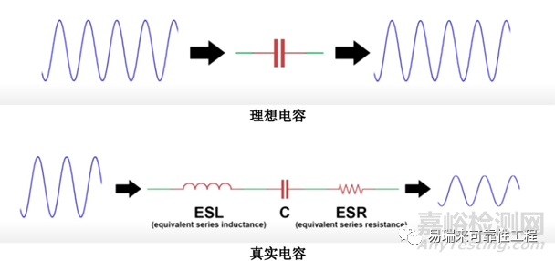 首先我們要了解電容的實(shí)際特性。實(shí)際電容器中除有容量成分C外,還有因電介質(zhì)或電極損耗產(chǎn)生的電阻(ESR)及電極或?qū)Ь€產(chǎn)生的寄生電感(ESL)。