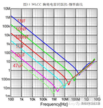 來看下圖11常規(guī)的MLCC陶瓷電容的阻抗-頻率曲線圖??梢钥闯觯煌碾娙?,曲線是不同的。