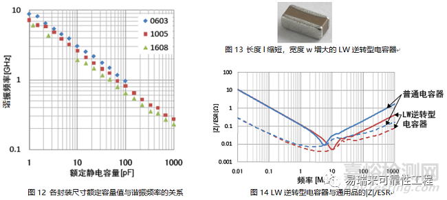 下圖表示各尺寸多層陶瓷電容器的額定容量與諧振頻率的關(guān)系。相同容量,尺寸越小,諧振頻率越高,則ESL越小。由此,可以說長(zhǎng)度l較短的小型電容器適用于高頻領(lǐng)域。