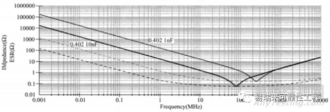 那為什么只有低頻段是C越大而Xc越小呢?從電容容抗定義來說,Xc=1/jωC,應(yīng)該是一直是C越大而容抗越小。那是因?yàn)榧纳姼蠰的原因,當(dāng)寄生電容器達(dá)到諧振頻率之后,電容器的阻抗Zc就會(huì)逐漸增加,而容值C越小則諧振頻率點(diǎn)就越大(電容器諧振點(diǎn)頻率對(duì)應(yīng)的其最小阻抗:ESR)。