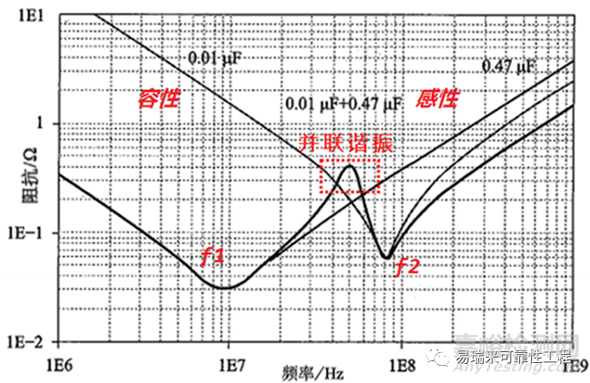 當(dāng)噪聲頻率大于f1并小于f2時(shí),大電容呈感性、小電容呈容性,兩者并聯(lián),等效為一個(gè)電感和一個(gè)電容并聯(lián),構(gòu)成了LC并聯(lián)諧振電路,并在某一個(gè)頻率點(diǎn)發(fā)生并聯(lián)諧振,導(dǎo)致該處阻抗很大。如果負(fù)載芯片的電流需求正好落在這個(gè)頻率,那么會(huì)導(dǎo)致電壓波動(dòng)超標(biāo)。所以,需要選擇合適的電容進(jìn)行搭配并聯(lián)。