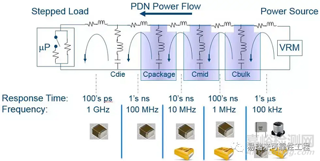 1)VRM電壓變換單元輸出的噪聲:像我們常用的LDO和DC/DC等,在輸出電壓時(shí),都會(huì)有一定的輸出紋波,在器件的Datasheet中有明確的規(guī)格參數(shù)。原理上,LDO、DC/DC之類的穩(wěn)壓芯片都是通過感知的輸出電壓與電流對(duì)輸出做調(diào)整,但是這個(gè)調(diào)整是需要時(shí)間的,一般當(dāng)負(fù)載電流的變化在DC到幾百kHz內(nèi)時(shí),VRM單元可以做出很好的響應(yīng)。如果負(fù)載瞬態(tài)電流的變化速率要求更高,輸出就會(huì)出現(xiàn)電壓跌落,形成噪聲,這時(shí)就需要添加額外的去耦電容來滿足需求。