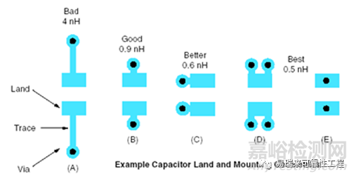 (E)最后一種方法在焊盤上直接打孔,寄生電感最小,但是焊接是可能會(huì)出現(xiàn)問題,是否使用要看加工能力和方式。