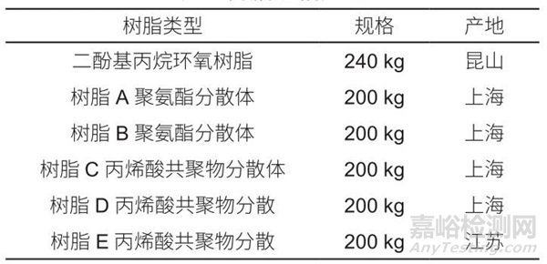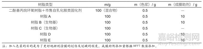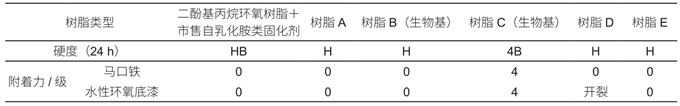 并且環(huán)氧固化劑一般為胺及其加成物(含脂環(huán)胺、脂肪胺以及雜環(huán)胺)等。胺及其加成物一般黏度較低,但低溫固化性能較差,一般反應(yīng)溫度應(yīng)在 10 ℃以上。并且由于含有游離胺,對(duì)潮氣敏感,施工濕度高時(shí)容易與空氣中的水、二氧化碳反應(yīng),在涂層表面生產(chǎn)銨鹽,進(jìn)而影響其后續(xù)涂層的附著力。并且二酚基丙烷環(huán)氧樹脂體系的耐候性差,不適用于戶外的地坪涂裝。因此需要對(duì)樹脂進(jìn)行篩選,選擇性能能夠匹配二酚基丙烷環(huán)氧樹脂,并符合生物基、綠色環(huán)境友好的要求。在市售的乳液中選擇 5 款樹脂,其中樹脂 A、D、E 為高 T g 樹脂,樹脂 A 是一種自交聯(lián)并且耐水解的樹脂,具有良好的硬度和耐化學(xué)品;樹脂 D 具有良好的耐化學(xué)品和耐戶外污漬的性能,并能快速建立硬度;樹脂E 是一種高硬度自交聯(lián)乳液,具有良好的硬度、耐化學(xué)品和抗黏連性。樹脂 B、C 為生物基乳液,樹脂 B是一種自交聯(lián)并且耐水解的樹脂,具有良好的初期硬度、快干、良好的耐化學(xué)品等特性,其生物基含量為35%(ASTM D6866-20 B);樹脂 C 是一款具有良好抗黏連性的生物基乳液,其生物基含量為 37%(ASTMD6866-20 B)。除了基本的數(shù)據(jù)外,還應(yīng)該測試樹脂在涂料里的干燥速率,因?yàn)楦稍锼俣龋ǜ稍锼俣葏⒖糀STM D7488,并未采用時(shí)間制,而是通過時(shí)間制進(jìn)行評(píng)分)會(huì)影響初期硬度的建立。
