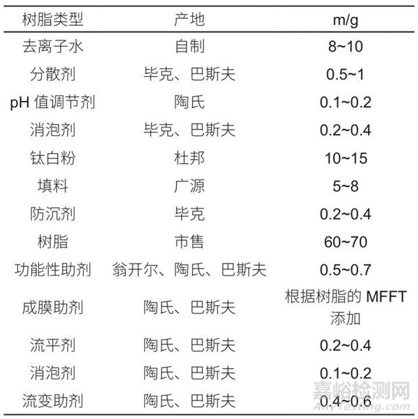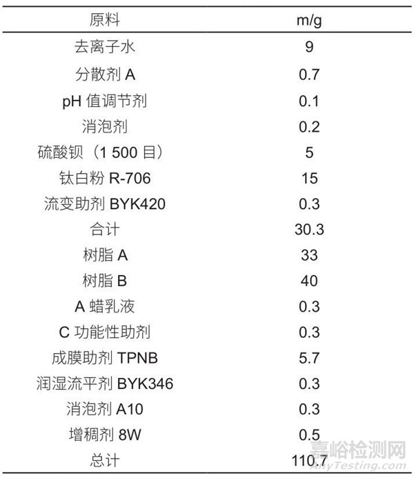 按照設(shè)計(jì)配方準(zhǔn)確稱量去離子水、pH 值調(diào)節(jié)劑、潤濕劑、消泡劑、顏填料,并依次加入不銹鋼分散缸中。經(jīng)高速分散,轉(zhuǎn)速 1 500 r/min,按體積比,加入研磨鎬珠,研磨至細(xì)度< 25 μm 時(shí),過濾 120 μm。然后按照配方用量加入樹脂。并依次向不銹鋼分散缸中加入配方所規(guī)定質(zhì)量的其余原料,最終調(diào)節(jié)黏度為90 ~ 95KU,攪拌均勻后,制得涂料。