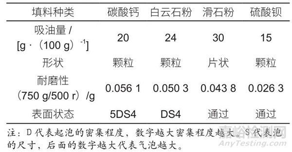 填料也是涂料的重要組成部分。填料的種類、硬度純度、穩(wěn)定性、吸油量、粒徑、形狀等對(duì)涂料的性能也有著直接的影響。在研究的過程中,會(huì)傾向低吸油量,耐磨性、耐化學(xué)品(酸堿)性好的填料。因此我們在篩選填料的時(shí)候,會(huì)著重測試吸油量、耐磨性、耐化學(xué)品性等?,F(xiàn)將不同的填料添加到同一基礎(chǔ)配方中,并根據(jù)固含量調(diào)整配方保證 PVC 一致,結(jié)果見表 12。