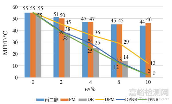 篩選了市售的成膜助劑,并根據(jù) HJ 2537—2014標(biāo)準(zhǔn)中所要求的和配方設(shè)計(jì)的需要(良好的初期硬度),進(jìn)行了篩選,測試結(jié)果見表 8。成膜助劑對(duì) MFFT 的影響(初始 MFFT 為 55 ℃)如圖 2 所示。