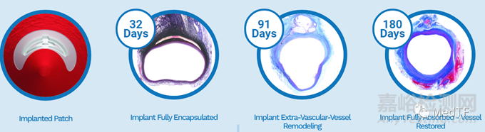 支架近端部分延伸穿過動脈切口,遠(yuǎn)端部分與貼片連接,從而保證貼片固定于切口處。植入后,植入物表面迅速內(nèi)皮化并被組織完全吸收。