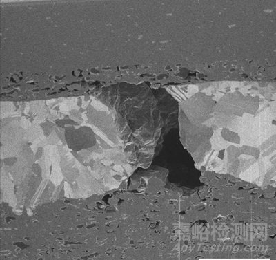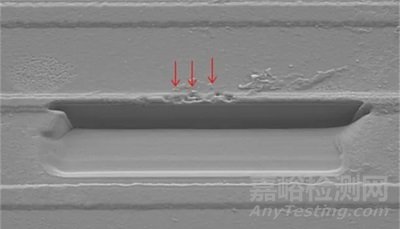 (2) 產(chǎn)品表面存在微納米級缺陷,如異物、腐蝕、氧化等問題,需觀察缺陷與基材的界面情況,利用FIB就可以準(zhǔn)確定位切割,制備缺陷位置截面樣品,再利用SEM觀察界面情況。