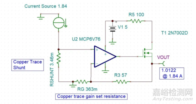 圖1所示的簡(jiǎn)化原理圖,為初步測(cè)試上述概念所用的基本電路。運(yùn)算放大器驅(qū)動(dòng)MOSFET,并通過(guò)增益電阻提供所需的反饋電流,電壓輸出與測(cè)量電流成正比。這是一個(gè)專為“低側(cè)檢測(cè)”設(shè)計(jì)的基本電路,其中電流分流器的一個(gè)端子接地,放大器輸出參考點(diǎn)為地。