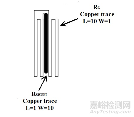 本文設(shè)計(jì)思路是創(chuàng)建兩個(gè)具有幾何關(guān)系的電阻,該幾何關(guān)系將確定所需增益。例如,考慮一個(gè)大電流路徑(稱為RSHUNT),其(歸一化)尺寸如下:L (長(zhǎng))=1,W (寬)=10。而增益設(shè)置元件(稱為RGcreate)則采用另一種圖形,即L=10,W=1。這樣得出的尺寸比、進(jìn)而得到的電阻比為100:1。由于增益電阻的作用是對(duì)大電流RSHUNT路徑進(jìn)行溫度補(bǔ)償,因此其位置應(yīng)對(duì)稱,并靠近RSHUNT元件。