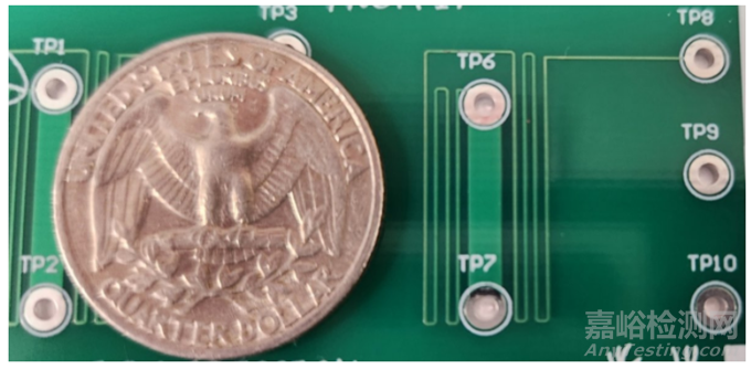 圖3中的25美分硬幣,是用來(lái)比擬電路板實(shí)際尺寸的。從TP6到TP7的跡線就是分流電阻RSHUNT,而從TP6到TP8的跡線則是銅增益電阻RG。被硬幣覆蓋的部分則是相同功能的拼版電路。